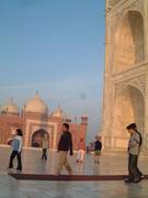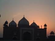 Den 2 Dekaden spaeter fertig gestellten Bau, dessen Arbeitern danach die Haende abhackte wurden um ein Ueberlaufen zum Konkurrenten zu verhindern, diesen also bewunderte Jahan am liebsten von der Flußseite aus. Eingerahmt wird er links und rechts von einer Moschee aus rotem Sandstein. 22 nebeneinander gereihte Kuppeln versinnbildlichen die Zahl der Jahre, die man für seine Fertigstellung benötigte.